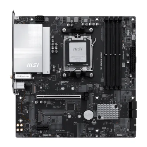 The MSI PRO B840M-P WIFI6E motherboard is intended for modern PC builders who require performance, stability, and flexibility in a single compact micro-ATX board. It is based on the AMD B840 chipset and supports the latest AMD Ryzen 9000, 8000, and 7000 series desktop CPUs with socket AM5, making it a future-ready option for both gaming and professional applications. Memory performance is a notable highlight, as it supports up to 256GB of DDR5 across four UDIMM slots with dual-channel design. The MSI PRO B840M-P WIFI6E Motherboard can reach overclocked rates of 8000+ MT/s depending on the CPU and configuration. Support for AMD EXPO makes RAM overclocking easier and more stable. The board's design prioritizes durability and thermal performance, with features such as a 7+2+1 power phase system, expanded heatsinks, and MOSFET thermal pads rated at 7W/mK, which ensure consistent cooling for high-performance applications. The MSI PRO B840M-P WIFI6E Motherboard boasts equally amazing storage with two M.2 slots that enable PCIe 4.0 x4 NVMe SSDs and four SATA 6Gb/s connections, as well as RAID setups for both SATA and M.2 devices. A PCIe 4.0 x16 slot for graphics cards and a PCIe 3.0 x1 slot for additional peripherals are among the expansion choices. It has a Realtek 8125D 2.5G LAN and built-in Wi-Fi 6E with Bluetooth 5.3, ensuring high-speed, robust networking in gaming and professional environments. Onboard graphics are supported via HDMI 2.1 at 4K @ 60Hz, depending on the CPU. The MSI PRO B840M-P WIFI6E Motherboard's audio system is driven by the Realtek ALC897, which provides 7.1-channel high-definition audio for immersive entertainment. USB connectivity is diverse, with USB 2.0, USB 3.2 Gen1 5Gbps, and speedier 10Gbps Type-A and Type-C connectors on both the back and front panels. Additional features such as the EZ M.2 Clip, EZ PCIe Clip, and EZ Debug LEDs facilitate construction and debugging. The MSI PRO B840M-P WIFI6E, which supports Windows 11 64-bit, RGB headers, and durable thermal solutions, provides a balanced combination of performance, durability, and user-friendly design for a powerful desktop setup.