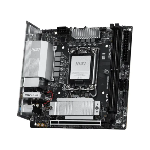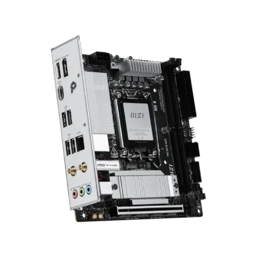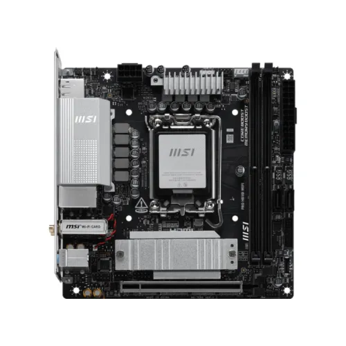 The MSI PRO H810I WIFI LGA 1851 Mini-ITX motherboard is a small but powerful option for modern PC setups that require cutting-edge performance and next-generation connections. It is powered by the Intel H810 chipset and supports Intel Core Ultra Processors (Series 2) on the LGA 1851 socket, making it a long-term option for those seeking a dependable platform for productivity, gaming, and multimedia operations. MSI PRO H810I WIFI Mini-ITX motherboard supports dual-channel DDR5 memory, allowing up to 128GB of capacity and speeds up to 6400 MT/s, while Intel XMP 3.0 provides seamless overclocking for improved performance. The MSI Mini-ITX motherboard has Core Boost and Memory Boost technologies to ensure consistent power delivery and clean data transmission, resulting in efficiency for demanding applications. MSI's Frozr Guard provides cooling, which features an expanded heatsink, M.2 Shield Frozr, and MOSFET thermal pads rated at 7W/mK to keep temperatures under control during heavy operation. A PCIe 5.0 x16 slot allows for expansion with the latest graphics cards, while a PCIe 4.0 x4 M.2 slot and two SATA 6Gb/s connectors provide storage support. The MSI PRO H810I WIFI Mini-ITX motherboard supports Intel I226 2.5Gbps LAN and sophisticated Wi-Fi 7 with Bluetooth 5.4 for safe, stable, and ultra-fast networking at speeds of up to 2.9Gbps. Display choices include HDMI 2.1 and DisplayPort 1.4, with 4K resolution at 60Hz depending on the CPU. The Realtek ALC897 codec handles audio, and the 7.1-channel high-definition sound ensures an immersive experience. The USB possibilities are wide, with a 20Gbps Type-C on the back, a 10Gbps Type-C on the front, several USB 5Gbps, and more USB 2.0 ports. Features such as EZ PCIe Clip II, EZ Debug LEDs, and EZ Memory Detection facilitate installation and troubleshooting, while RGB headers allow for more customization. The MSI PRO H810I WIFI Mini-ITX motherboard, which supports Windows 11 64-bit, strikes the perfect balance between tiny form factor, robust performance, and next-generation networking, making it an excellent choice for both small form factor enthusiasts and professionals.