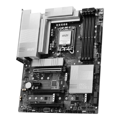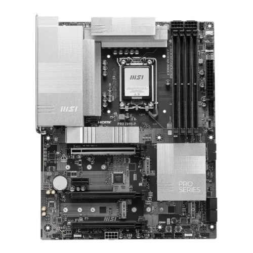 The MSI PRO Z890-P LGA 1851 ATX motherboard supports Intel Core Ultra Processors (Series 2) with an LGA 1851 socket. The MSI Z890 motherboard supports DDR5 memory at rates of up to 9200+ MT/s (OC) and a maximum capacity of 256GB, providing great performance and multitasking capabilities. MSI PRO Z890-P LGA1851 motherboard features a powerful 14+1+1+1 Duet Rail Power System with 55A DrMOS, dual 8-pin CPU power connectors, and a 6-layer PCB composed of 2oz thicker copper, ensuring consistent power delivery and greater dependability for demanding workloads. The enlarged heatsink, MOSFET thermal pads rated for 7W/mK, and EZ M.2 Shield Frozr II offer improved thermal performance. The MSI PRO Z890-P LGA 1851 ATX motherboard offers cutting-edge connectivity for professionals and gamers, with PCIe 5.0 slots, support for Lightning Gen 5 x4 M.2, and a Thunderbolt 4 connector with up to 40Gbps transfer speeds and compatibility for 8K displays. For professional and multimedia applications, the 5Gbps LAN and Intel Wi-Fi 7 provide fast and reliable networking, and Bluetooth 5.4 guarantees smooth wireless integration. With four M.2 slots (with PCIe 5.0 compatibility) and four SATA 6G connections, the MSI Intel Ultra Series Motherboard offers a wide range of storage options. RAID support is available for both SATA and NVMe devices. Additionally, the MSI PRO Z890-P LGA 1851 ATX motherboard supports 4K and 8K resolutions with HDMI 2.1, DisplayPort 1.4, and a Type-C DisplayPort. USB connectivity offers a variety of fast alternatives, such as USB 10Gbps Type-A and USB 20Gbps Type-C ports. With features like RGB and addressable LED connectors, TPM 2.0 support, Audio Boost for high-definition sound, and extensive fan headers, the MSI LGA1851 Motherboard is also a flexible option for professional setups, gaming, and video production. For sophisticated users, the MSI PRO Z890-P is a dependable and feature-rich motherboard that is compatible with Windows 11 64-bit.