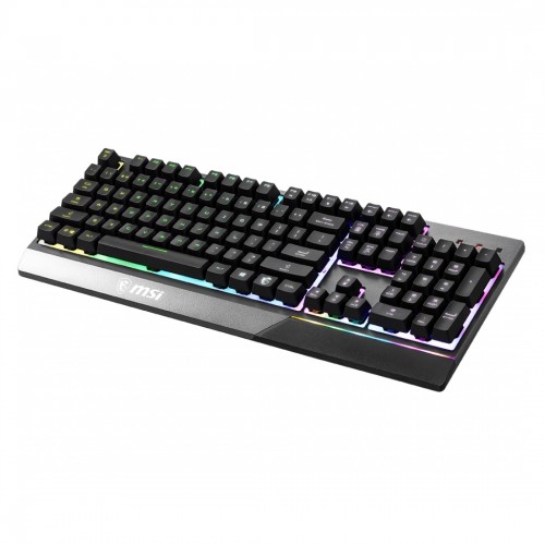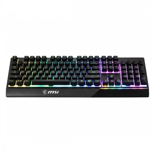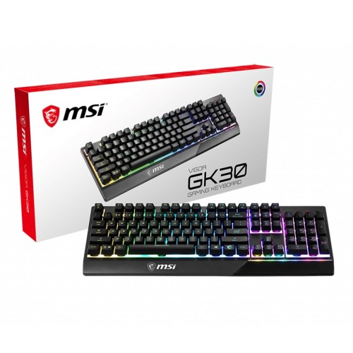 The MSI VIGOR GK30 Gaming Keyboard features Mechanical-like plunger switches for a crisp typing experience These mechanical-like plunger switches with 3-part construction provide a crisp typing experience with over 12 million life span. This keyboard supports millions of colors and up to 10 lighting effects in 6 lighting areas via Dragon Center. At the top are hotkeys for volume adjustment and media controls. These convenient lighting hotkeys allow you to change speed, direction, or mode without installing software. It has a water-resistant floating key design that looks great, and also makes it easy to clean when it gets dirty. It comes with an extremely steady Gaming Base right under the space bar provides increased support and improves anti-slip performance while gaming. The MSI VIGOR GK30 comes with a 1-year warranty.