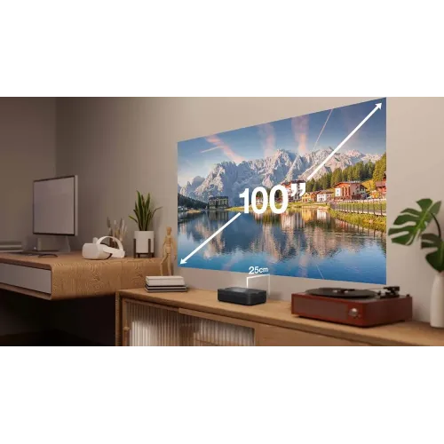 The Optoma Photon Go is a Full HD projector powered by advanced RGB triple laser technology. Delivering 150% DCI-P3 color coverage and 110% BT.2020 accuracy, it produces vibrant, lifelike visuals with cinema-grade detail and exceptional contrast. Its ultra-short-throw lens projects up to a 100-inch image from just inches away, making it perfect for small spaces and big entertainment. Designed for portability, the Optoma Photon Go Portable DLP Projector features a built-in battery offering up to 1.5 hours of wireless playback and doubles as a Bluetooth speaker with up to 4 hours of music time. With Google TV and Google Assistant integration, users can seamlessly stream Netflix, Disney+, and thousands of apps via the Google Play Store. Auto keystone and focus correction ensure a perfectly aligned image every time, while Dolby Audio and dual 10W speakers immerse you in rich, dynamic sound. Compact yet powerful, this projector supports HDR10, HLG, and 4K decoding, and includes HDMI 2.0, USB-C, and WiFi 5GHz/Bluetooth connectivity. Whether you're at home or on the move, the Optoma Photon Go Projector transforms any surface into a stunning big-screen experience just point and play.
