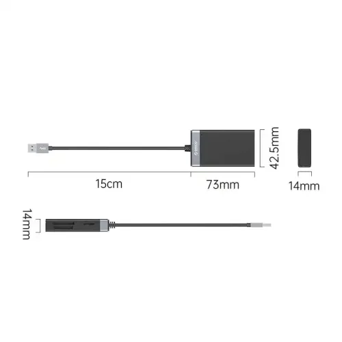 The ORICO CL4T-A3 is a versatile 4-in-1 USB Type-C multifunction card reader designed to meet your diverse data transfer needs efficiently. This compact and sleek device is an essential addition to your tech arsenal, offering the ability to read four different types of memory cards simultaneously, making it an ideal solution for photographers, videographers, and anyone working with multiple storage media. The ORICO CL4T-A3 is equipped with a USB-A 3.0 interface, allowing you to read four different types of memory cards at the same time. This feature saves you time and effort when transferring data from various sources. This card reader supports TF (Micro SD), SD, CF, and MS memory card formats, ensuring compatibility with the most commonly used memory card types. Whether you're dealing with camera cards, smartphone storage, or other devices, this card reader has you covered. With a blazing-fast transmission rate of 5Gbps, you can transfer large files quickly and efficiently. This high-speed capability is especially crucial when working with high-resolution images and videos. The ORICO CL4T-A3 is built to last, featuring a combination of ABS and aluminum alloy materials. This robust construction ensures durability and longevity, making it suitable for frequent use in various environments. Its black color and compact dimensions (73 x 42.5 x 14mm) make the ORICO CL4T-A3 not only functional but also aesthetically pleasing. It easily fits into your pocket or laptop bag for on-the-go data access. The attached 15cm conjoined cable provides a hassle-free connection to your computer or USB-enabled device. This eliminates the need for additional cables and ensures a secure and reliable connection. The ORICO CL4T-A3 4-in-1 USB Type-C multifunction card reader is your all-in-one solution for managing and transferring data from various memory card formats. Whether you're a professional photographer, videographer, or simply someone who wants a versatile card reader for personal use, this device offers speed, convenience, and reliability in a sleek and durable package. Say goodbye to the hassle of switching between multiple card readers and streamline your data management with this multifunctional tool.