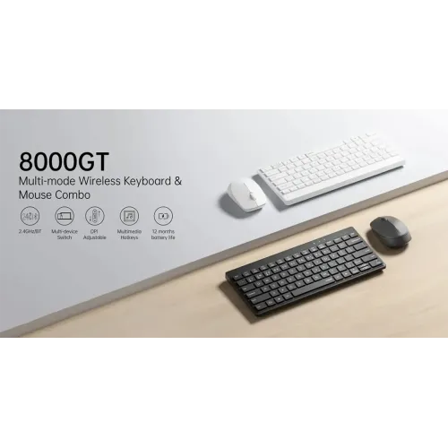 The Rapoo 8000GT Multi-mode Wireless Keyboard & Mouse Combo is a high-performance, multi-platform solution designed for users who value flexibility, comfort, and long-lasting reliability. With dual connectivity options Bluetooth and 2.4GHz wireless this combo allows seamless switching between devices running Windows, Mac OS, Chrome OS, Android, and iOS. The keyboard features 80 durable ABS keycaps with a lifespan of up to 10 million keystrokes and a 2mm travel distance, delivering a responsive and comfortable typing experience. Its symmetrical design suits both left- and right-handed users, and its compact form factor makes it ideal for mobile workstations and minimalist setups. Powered by a single AA alkaline battery, the keyboard offers up to 12 months of battery life, reducing the need for frequent replacements.The optical mouse complements the keyboard with adjustable DPI settings ranging from 800 to 2400, allowing users to fine-tune cursor sensitivity for different tasks such as browsing, editing, or gaming. It supports a maximum acceleration of 10G and a tracking speed of 30 inches per second, ensuring smooth and accurate performance. The mouse includes four buttons and a two-way scroll wheel for enhanced navigation, and its ergonomic design promotes comfort during extended use. Like the keyboard, the mouse is powered by a single AA alkaline battery with a 12-month lifespan and connects via a nano USB receiver for easy plug-and-play functionality.Designed for universal compatibility and efficient performance, the Rapoo 8000GT combo is perfect for professionals, students, and tech enthusiasts who need a reliable and stylish input solution. Its multi-mode wireless technology ensures stable connections and minimal latency, while the lightweight build and long battery life make it a practical choice for both stationary and mobile setups. Whether you're working across multiple devices or simply looking for a clutter-free workspace, the Rapoo 8000GT delivers a seamless and productive experience.