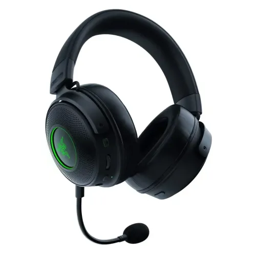 The Razer Kraken V3 Pro Wireless Gaming Headset delivers clear and immersive sound across the entire audio spectrum, with a frequency response of 20 Hz - 20 kHz and an impedance of 32 (1 kHz). The 50 mm Razer TriForce Titanium drivers deliver precise and powerful audio reproduction, improving gaming audio and overall listening enjoyment. The Razer Kraken V3 Pro features passive noise cancellation, which reduces background noise and allows gamers to focus on their gameplay without distractions. It has multiple connection options, including USB-A wireless (2.4GHz) and 3.5mm analog, giving it versatility for different devices. The oval ear cushions provide a comfortable and ergonomic fit, and the inner earcup diameter of 42 mm (width) and 62 mm (length) accommodates different ear sizes. For long-lasting comfort during extended gaming sessions, the earpads are made of heat-transfer fabric, leatherette, and memory foam. With its unidirectional pick-up pattern and frequency response of 100 Hz - 10 kHz, the detachable HyperClear SuperCardioid microphone guarantees accurate and clear voice communication. The microphone's sensitivity (at 1 kHz) is -42 3 dB. The Razer Kraken V3 Pro features THX Spatial Audio technology, providing virtual surround sound for an immersive gaming experience. It also offers convenient volume control and a mic mute on/off toggle for quick adjustments. The headset includes Razer Chroma RGB lighting, allowing users to customize the headset's lighting effects. The headset offers an impressive battery life of up to 44 hours with haptics and lighting off. The battery life is up to 11 hours with haptics and lighting enabled, ensuring uninterrupted extended gaming sessions.
