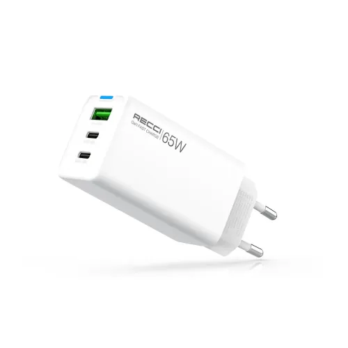 The Recci RC109E 65W GaN Charger Adapter is a high-performance, compact charging solution built with advanced GaN (Gallium Nitride) technology, allowing faster and more efficient power delivery in a sleek, lightweight design. Engineered for versatility, the Recci RC109E 65W Charger Adapter features three output ports—two USB Type-C and one USB Type-A—to charge multiple devices simultaneously. Delivering a maximum output of 65W, the USB-C1 port supports up to 65W (20V/3.25A), ideal for powering laptops and other high-demand devices, while USB-C2 offers up to 20W, and USB-A delivers up to 18W, all with support for PD3.0, QC3.0, and PPS fast charge protocols. Intelligent power distribution allows combinations such as 45W + 15W when using USB-C1 with either C2 or A, and 45W + 15W even when all three ports are in use, making the Recci RC109E Charger Adapter perfect for tech users on the go. It operates on a global voltage range (100-240V~50/60Hz 1.5A Max) and includes multi-level protection for enhanced safety. Weighing only 118g and measuring 66 x 32 x 38mm, this charger comes in a clean white finish with an EU plug type, combining functionality and portability. The Recci RC109E 65W GaN Charger Adapter is the ideal choice for anyone seeking fast, safe, and multi-device charging in one compact adapter.