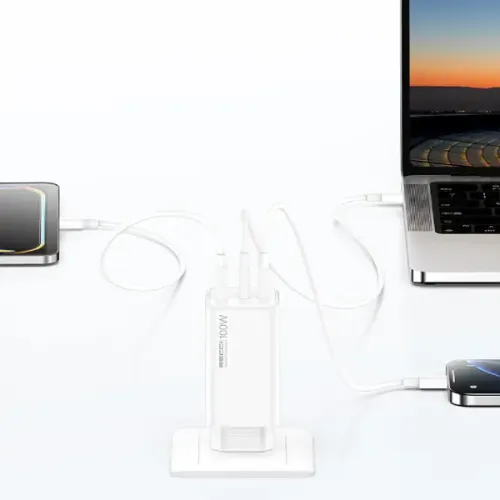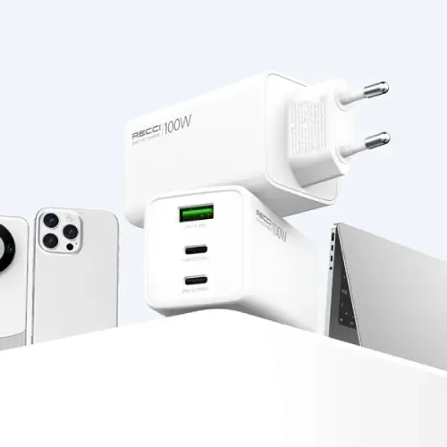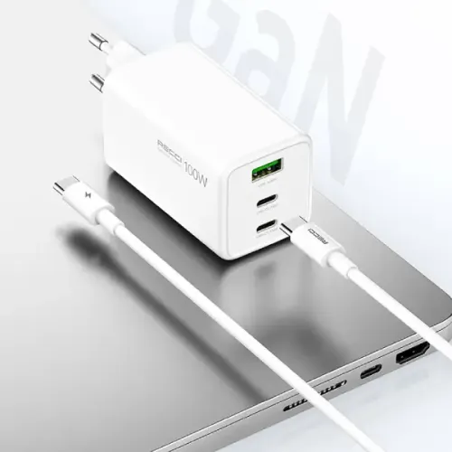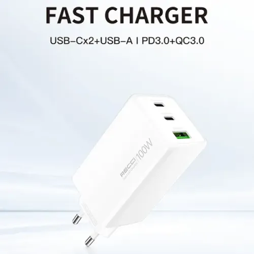 The Recci RC110E 100W GaN Charger Adapter is a high-performance, compact charging solution engineered for fast, efficient, and safe power delivery. Powered by advanced GaN (Gallium Nitride) technology, the Recci RC110E Charger Adapter ensures superior thermal management and compact size without sacrificing power. With a maximum output of 100W, it features dual Type-C ports and one USB-A port, making it ideal for charging laptops, smartphones, tablets, and other USB-enabled devices. Supporting a wide input range of 110V to 240V~ at 50Hz/60Hz 2A, the Recci RC110E 100W Charger Adapter is perfect for international use. The USB-C1 and USB-C2 ports offer versatile outputs of 5V-3A, 9V-3A, 12V-3A, 15V-3A, and 20V-5A, along with PPS (3.3V-21V ⎓ 5A), while the USB-A port supports up to 30W. When used simultaneously, power is intelligently distributed: USB-C1+C2 (65W+30W), USB-C1+A (65W+18W), USB-C2+A (12W+12W), and all three together at 65W+24W—reaching a total output of 100W Max. Designed with convenience and style in mind, the Recci RC110E 100W GaN Charger Adapter features a sleek white finish, compact dimensions of 40 × 41 × 71mm, and weighs just 195g for portability. With support for PD3.0, QC3.0, and PPS fast charging protocols, along with built-in multi-level protection for voltage, current, and temperature, the Recci RC110E 100W Charger Adapter ensures safe and reliable charging wherever you go.