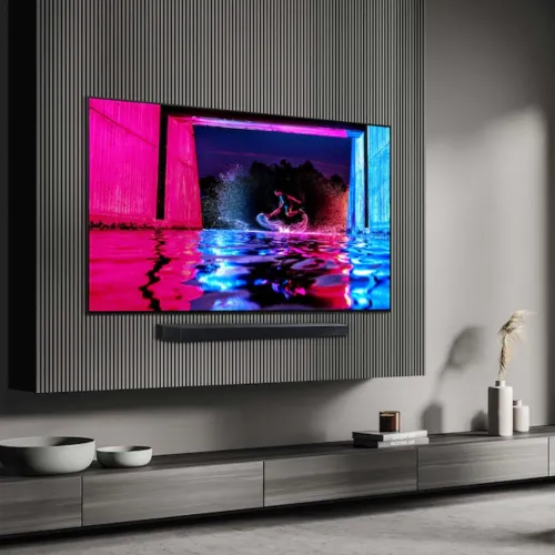 Sound is just as impressive as the visuals on the Samsung 83S90D. Equipped with Dolby Atmos and Object Tracking Sound Lite, audio flows dynamically across the room, matching on-screen action. The Q-Symphony feature synchronizes TV speakers with compatible Samsung soundbars for a fuller surround sound effect. With 40W RMS output through a 2.1 channel speaker system, voices are clear, bass is deep, and effects are powerful. Features like Adaptive Sound Pro and Active Voice Amplifier automatically adjust audio to suit your environment, ensuring dialogue clarity even in noisy settings. This AI Smart TV makes every movie, show, or game sound spectacular.