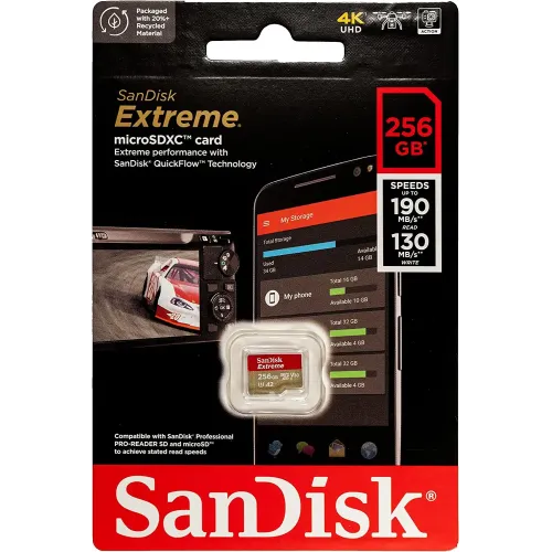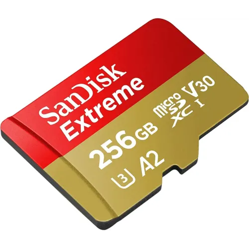 The SanDisk Extreme 256GB 190mbps microSDXC UHS-I Memory Card is a high-performance memory card designed for use with microSD devices such as smartphones, drones, and action cameras. It is capable of capturing Full HD and 4K video, as well as raw and burst photography. This memory card has a capacity of 256GB and is compatible with the UHS-I bus. It features a speed class rating of V30, which guarantees minimum write speeds of 30 MB/s. If your device does not support the V30 standard, the card also supports the U3 standard, which also guarantees minimum write speeds of 30 MB/s. The read speeds of this card are supported up to 190 MB/s, while the write speeds max out at 130 MB/s. The SanDisk Extreme microSD card is great for capturing 4K UHD video, making it ideal for recording outdoor adventures, weekend trips, or sporting events without skipping frames. With 256GB of storage, it lets you capture uninterrupted 4K UHD and Full HD video with its UHS Speed Class 3 (U3) and Video Speed Class 30 (V30) ratings.