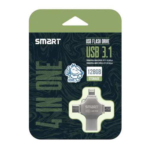 The Smart SuperFast SM8 is a 4-in-1 USB 3.1 pen drive with a 128GB capacity and enough space to save documents, images, videos, and other important things. With sequential read and write speeds of up to 160 Mbps and 110 Mbps, respectively, the pen drive's state-of-the-art USB 3.1 interface guarantees blazingly quick data transfer rates. With Type-C, Micro USB, and Lightning ports, this Smart SuperFast SM8 128GB USB Pen Drive is compatible with a variety of devices and is perfect for smooth data transfer between computers, smartphones, and tablets. It also has USB 2.0 backward compatibility, which increases its suitability for older gadgets. This Smart SuperFast SM8 128GB 4-in-1 USB 3.1 Pen Drive is designed for durability and design, with a sleek metal chassis that not only provides long-lasting performance but also resists wear and tear from frequent usage. It is convenient for professionals, students, and tourists equally due to its lightweight and small design. The Smart SuperFast SM8 128GB 4-in-1 Metal Body USB 3.1 Pen Drive is designed to effectively handle difficult data management needs, whether you're backing up crucial work documents or moving high-resolution media files.