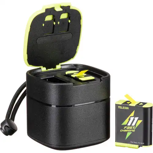 The TELESIN Quick Charge Charging Case and Battery Set for GoPro 9/10/11 is the perfect accessory for GoPro enthusiasts who need to stay charged and ready to go at all times. With this kit, you can store and simultaneously charge up to two batteries for your HERO11, HERO10, or HERO9 Black camera. This means you'll always have a spare battery on hand and won't have to wait for a recharge in the middle of an adventure. The kit includes a two-slot charger/storage box that features two slots to store microSD/TF cards. It can charge the batteries up to 75% in approximately 30 minutes, which is significantly faster than traditional charging methods. Additionally, the box supports fast charging utilizing an optional 18W PD charger to fast charge one battery, and it requires a 30W PD charger to fast charge both batteries. Each battery is fully decoded, so it'll display the remaining battery life on the camera display, just like the original GoPro battery. The 1750mAh lithium-ion batteries are durable and feature numerous safety features, including a fireproof PVC casing and overcharge, overcurrent, overdischarge, short circuit, overvoltage, and undervoltage protections. This ensures the safety of both your camera and batteries while you're out exploring.