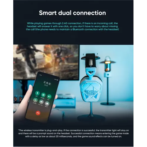 | Others | Material-Leather Active Noise-Cancellation Volume Control Control Button 16.8 million color RGB lighting effects Dual microphone ENC 20ms low latency |