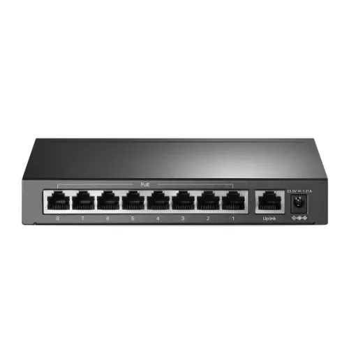 The TP-Link TL-SF1009P 9-Port 10/100Mbps Desktop Switch offers up to 30 W per PoE port by the 802.3af/at PoE+ standard. The total 65 W PoE power budget for the 8 PoE+ ports enables various applications, including monitoring for workplaces, dorms, and small companies. It works with IP cameras, access points, IP phones, laptops, printers, and other devices.