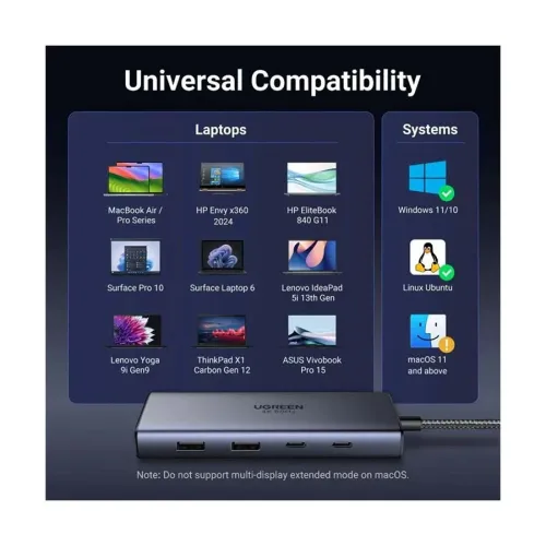 The Ugreen CM498 7-in-1 Type-C Multifunction Hub is a powerful connection solution that aims to increase productivity and simplify your digital life. The Ugreen CM498 Hub #45379 has a USB 3.2 Type-C male input and offers a variety of output interfaces, including 2x USB-A 3.2 ports, 2x USB-C 3.2 ports, 2x HDMI connections, and a PD charging connector that supports up to 100W Power Delivery for ultra-fast device charging. With a data transmission speed of up to 10Gbps, the Ugreen CM498 7-in-1 Multifunction Hub enables you to transfer huge files, stream 4K films, and easily connect numerous devices. Dual HDMI outputs enable 4K (3840 × 2160) quality, providing superb graphics for professional displays, gaming, and home entertainment. The Ugreen CM498 Multifunction Hub #45379 is compatible with both Windows and macOS and has plug-and-play capability, so no additional drivers or setup are required. Built with USB 3.2 technology, it ensures a robust network connection, dependable performance, and increased productivity. The Ugreen CM498 7-in-1 Type-C Multifunction Hub's tiny and lightweight design makes it ideal for professionals on the road, combining ease and versatility in a single stylish gadget.