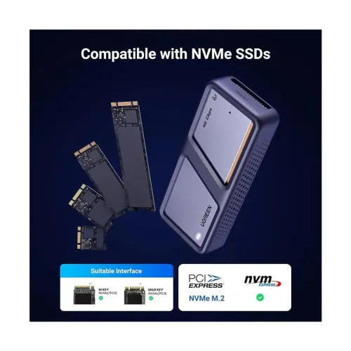 The UGREEN CM642 (15976) M.2 NVMe SSD Enclosure is a high-performance, plug-and-play solution designed for tech enthusiasts, content creators, and professionals seeking ultra-fast external storage. Engineered with a sleek aluminum shell and intelligent cooling fan, this enclosure supports PCIe NVMe SSDs in 2230, 2242, 2260, and 2280 form factors, delivering blazing transfer speeds up to 40Gbps via USB Type-C. Its wide compatibility spans MacBooks, PCs, iPads, PS4/5, and smartphones, making it ideal for data backup, media editing, and portable file access. With support for up to 4TB capacity, backward compatibility, and thermal management via silicone pads and active cooling, the Ugreen CM642 ensures secure, stable performance even under heavy workloads. Whether you're upgrading your workflow or safeguarding your data, this Ugreen SSD enclosure offers speed, style, and reliability in one compact package