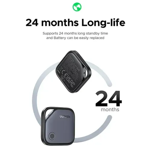 | Others | Certification: Apple Find My Certified (iOS, iPadOS, macOS only) Battery Type: Replaceable CR2032 button battery Battery Life: Up to 2 years (low-power chip, battery level viewable in Find My app) Child Safety: UL4200A certified, childproof cover design |