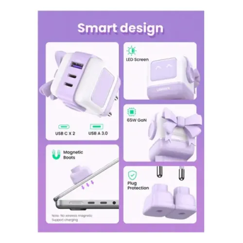 The Ugreen Nexode RG CD361 65W 3-Port GaN Fast Charger Adapter is a powerful charging solution that combines power, safety, and fun design in a small EU-standard connector. This Ugreen Nexode RG CD361 3-Port Charger Adapter has innovative Bold GaNFast Technology for quicker, cooler, and more efficient charging. With a maximum power output of 65W, it can charge devices such as the MacBook Air M2 from 0% to 51% in 30 minutes. The adapter has two USB-C ports and one USB-A port, allowing you to charge numerous devices at the same time, such as USB-C1 and USB-C2 at 45W and 20W, or all three ports at 45W + 7.5W plus 7.5W. The distinctive LED display on the face of this purple Ugreen Nexode RG CD361 65W Charger Adapter gives it a playful personality, changing emotions depending on charging status. Its multi-layered safety mechanism protects against short circuits, overheating, overvoltage, and overloads, making it one of the most secure and dependable chargers on the market. This Ugreen 65W 3-Port Charger Adapter supports a wide number of fast-charging protocols, including PD3.0, PPS, QC4 Plus, QC3.0, SCP, FCP, and AFC, and is compatible with a wide range of smartphones, tablets, and laptops. The Ugreen Nexode RG CD361 65W 3-Port GaN Fast Charger Adapter, measuring only 87.6 by 46.9 by 42.7 mm, is small enough for travel yet powerful enough for daily use, making it the ideal charging companion for tech lovers who value both efficiency and design.