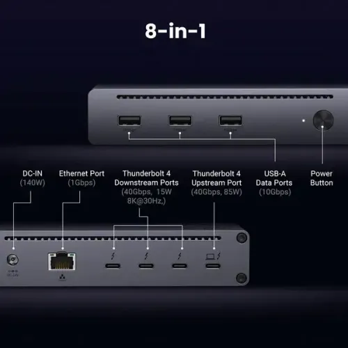 The Ugreen Revodok Max 208 U708 8-in-1 Docking Station is a powerful and versatile solution designed to expand your device connectivity. Compatible with devices like the MacBook Air, MacBook Pro, and Microsoft Surface Pro 7. This Ugreen 8-in-1 Docking Station offers a total of 8 ports, including 7 USB ports and an Ethernet port with support for speeds up to 1 Gbps, making it perfect for seamless internet connections. Powered by Thunderbolt 4 and USB 3.2 Gen 2 interfaces, the Ugreen Revodok Max 208 U708 delivers ultra-fast data transfer speeds up to 40 Gbps, allowing you to transfer large files quickly. Enjoy dual 4K resolution at 60Hz or a single 8K resolution at 30Hz, providing stunning visual quality for your work or entertainment needs. With 140W power delivery and 85W wattage output, the Ugreen U708 8-in-1 Hub ensures efficient charging and power management for your devices. Whether you need to enhance your workflow with more ports or need high-resolution displays, the Ugreen Docking Station is the ultimate choice for productivity and performance.