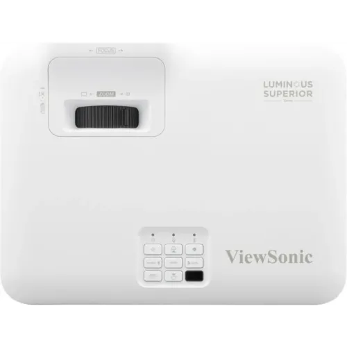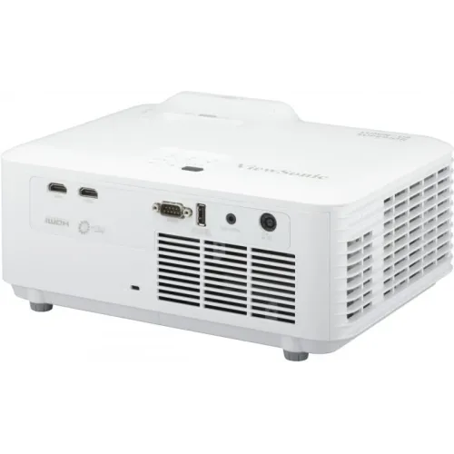 The ViewSonic LS740HD is a high-performance laser projector designed for commercial and educational environments, incorporating advanced-generation laser phosphor technology that extends its lifespan up to 30,000 hours. With a brightness of 5,000 ANSI Lumens, it produces vivid and bright images even in well-lit conditions, making it ideal for various settings. The projector supports an ultra-large screen size of up to 300 inches, offering a cost-effective solution for large displays in spaces like lecture halls, boardrooms, and public areas. Its compact and lightweight design not only facilitates easier transportation and installation but also reduces overall costs. Installation is further simplified with features such as 1.3x optical zoom, horizontal/vertical keystone correction, 360° projection, and portrait mode, providing significant flexibility for various setups. The LS740HD is part of ViewSonic’s Luminous Superior series, known for its high brightness and durability, and its lamp-free design contributes to an eco-friendly and cost-effective solution. The projector also offers instant power on/off, enhancing energy efficiency and user convenience. With its enhanced luminous efficiency and compact form factor, the LS740HD is an excellent choice for those seeking a reliable and versatile projection solution.