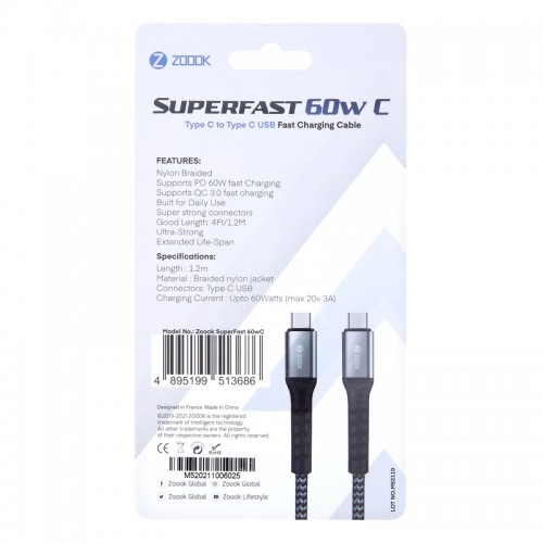 The ZOOOK Superfast 60W C is a USB Type-C to Type-C Fast Charging Cable which is made of a Braided Nylon Jacket. It supports PD 60W fast charging and it also supports QC 3.0 fast charging. It is built for daily use. The ZOOOK Superfast 60W C comes with super-strong connectors. This charging cable offers a good length of 1.2 meters. This charging cable is ultra-strong and it has an extended lifespan. The ZOOOK Superfast 60W C comes with no warranty.