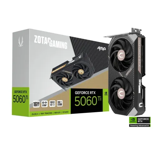 The ZOTAC GAMING GeForce RTX 5060 Ti AMP 16GB GDDR7 Graphics Card is an advanced, high-performance GPU designed for next-generation gaming and creative workloads. This ZOTAC 16GB Graphics Card is powered by NVIDIA's Blackwell architecture and DLSS 4, providing greater graphics performance and AI-enhanced images for a smooth and immersive experience. With 4608 CUDA cores and a boost clock speed of 2632 MHz, the ZOTAC GAMING GeForce RTX 5060 Ti AMP 16GB Graphics Card delivers ultra-fast rendering and real-time ray tracing in recent AAA titles. With 16GB of ultra-high-speed GDDR7 memory on a 128-bit interface and an amazing memory rate of 28 Gbps, this ZOTAC 16GB GPU easily tackles high-resolution textures and demanding workloads. The ZOTAC GAMING GeForce RTX 5060 Ti AMP Graphics Card is built on the latest PCI Express 5.0 x16 interface, allowing for maximum data throughput and future-proof compatibility. The GPU also has IceStorm 2.0 cooling technology, which includes two 90mm BladeLink fans, composite heatpipes, pass-thru airflow, and the FREEZE Fan Stop function, which allows for quiet operation under light loads. Its tiny dual-slot design and robust metal backplate make it an excellent choice for small form factor (SFF) projects without sacrificing performance. This ZOTAC Graphics Card has three DisplayPort 2.1a ports (supporting up to 15360×8460 @ 60Hz) and one HDMI 2.1b port, which supports 4K at 120Hz HDR, 8K at 60Hz HDR, and Variable Refresh Rate (VRR). It is ideal for multi-monitor setups, 8 K-ready content, and high-resolution gaming. The ZOTAC GAMING GeForce RTX 5060 Ti AMP Graphics Card provides a premium and future-ready visual experience, with support for HDCP 2.3, Quad Display capabilities, VR readiness, and graphics technologies like as DirectX 12 Ultimate and OpenGL 4.6. It's 36 Ray Tracing Cores, 48 ROPs, and 144 TMUs provide dramatic lighting and lifelike effects. The ZOTAC GAMING GeForce RTX 5060 Ti AMP 16GB GDDR7 Graphics Card, which requires a 600W power supply and draws 180W from a single 16-pin power connection, is the ultimate performance upgrade for gamers, creators, and power users who want elite-level performance in a sleek, powerful, and efficient package.